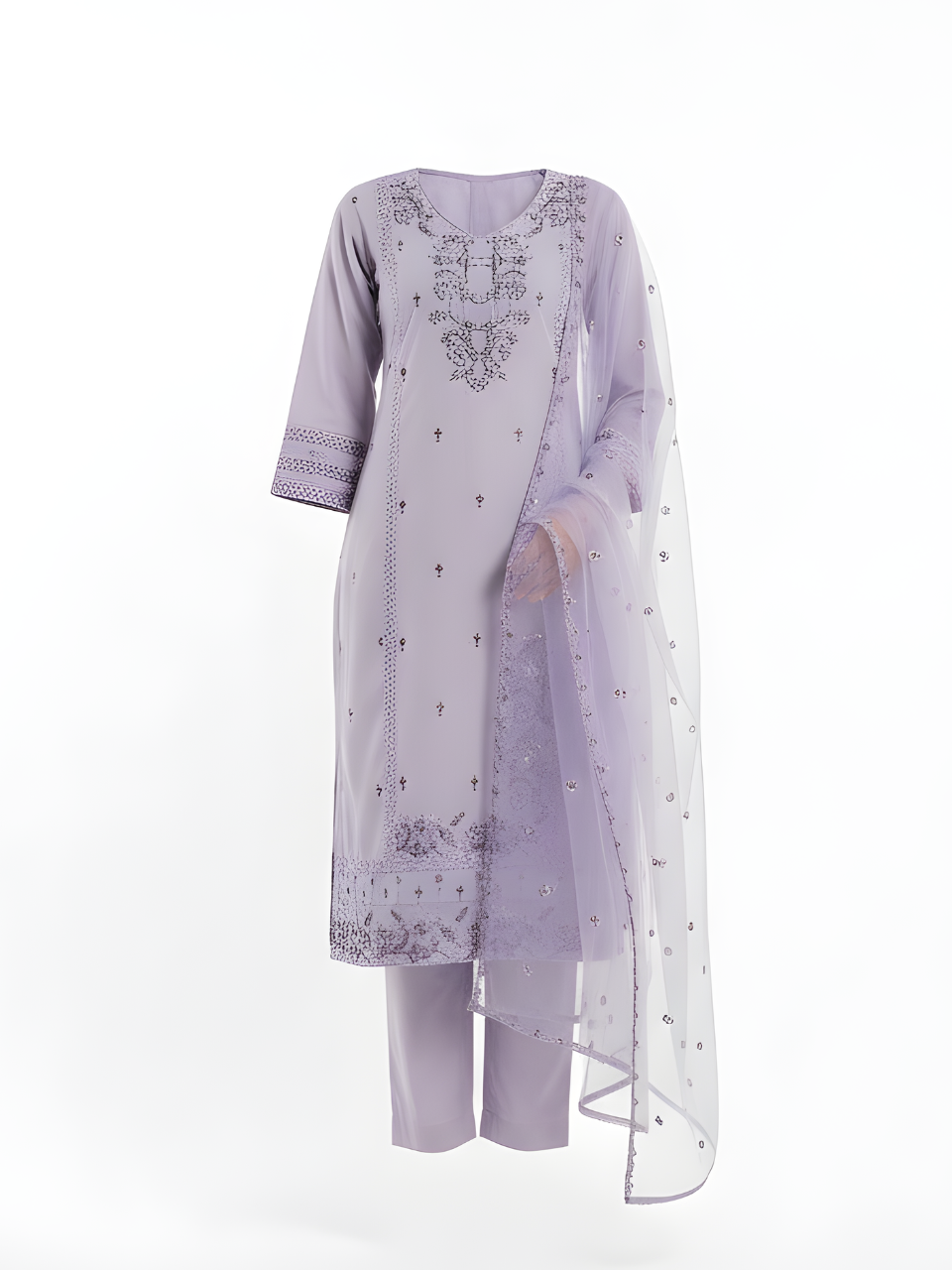 Elegant 3-piece organza suit set featuring a soft, lightweight embroidered top with inner lining, paired with a smooth-finish satin/crepe/silk blend bottom and a premium organza dupatta. Designed for a graceful drape, luxurious feel, and all-day comfort.